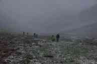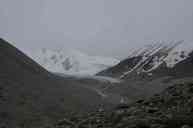 La vallée de Buzunbay se termine par un pic enneigé d’où descend un joli petit glacier. On sent que les choses sérieuses approchent ! Pourtant, ce glacier semble tellement insignifiant à l’échelle du massif qu’aucun nom n’en est porté sur les cartes. Le temps s’est gâté dans la soirée et nous n’avons pas échappé à l’orage, comme le montre l’une de mes photos. Mais cela n’a pas empêché les plus fanatiques de notre groupe de repartir en fin d’après-midi pour une montée supplémentaire au-dessus du camp, ce dont je me suis pour ma part abstenu (et il paraît qu’ils n’ont rien vu). ![]() Nous avons franchi le lendemain un col à 3800 m environ, pour lequel il ne semble pas exister de nom. Ce col permet de déboucher dans une vallée assez sauvage, en bas duquel se trouve un autre lac, le lac Akkol (оз. Акколь), près duquel nous camperons le soir. ![]() De ce col il est à nouveau possible d’apercevoir quelques sommets du T’ien-chan central, et notamment le fameux pic de Marbre (6145 m) que nous aurons l’occasion de revoir de beaucoup plus près. L’ascension sa paroi ouest, balayée par les chutes de séracs, constitue un défi d’alpinisme auquel quelques fous se sont bien évidemment attaqués ! ![]() La dégradation du temps est visible sur la précédente série de photos. Et cela ne devait pas s’améliorer le jour suivant. Nous nous sommes levés sous une pluie battante, et avons, non sans hésitations d’ailleurs, quitté le camp du lac Akkol dans les mêmes conditions. Une pluie qui s’est du reste assez vite transformée en neige alors que nous montions, tandis que le brouillard ne s’est pas levé un seul instant. Au programme de ce jour, le col d’Achutor (Ашутор), altitude 3700 m environ, un col lui-même surmonté d’un dôme de pierrailles du même nom duquel on peut jouir, en théorie bien évidemment, d’un exceptionnel panorama sur toute la chaîne des Monts Célestes. ![]() Nous avons bien évidemment fait une croix sur le dôme et nous