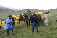 Nous ne sommes pas partis à pied de Karkara mais avons dû endurer une journée entière de piste dans un camion 6×6. Le genre de bétaillère dont ils sont si friands dans les ex pays soviétiques, d’où il est à peine possible de regarder le paysage. Avant de partir nous avons aussi dû nous plier à un rituel : la pesée des sacs. Ce voyage était très complexe dans son déroulement, nos bagages devant être portés par des chevaux dans un premier temps, puis par des porteurs et enfin être héliportés. D’où un strict contingentement de leur poids ; mais tout le matériel de montagne (piolets, crampons, cordes et affaires chaudes), dont nous n’avions pas besoin au début pour l’acclimatation, pouvait dans un premier temps être laissé à Karkara d’où il serait acheminé par hélicoptère jusqu’au glacier de Semienova (je ne dis pas dans quel état nous avons retrouvé nos affaires, d’ailleurs). Les pentes inférieures des montagnes du T’ien-chan ressemblent beaucoup aux Alpes : de vertes prairies, des forêts de conifères puis des alpages avant d’atteindre le domaine minéral, les glaciers et les neiges éternelles. On ne serait donc pas tant dépaysé que ça n’était la taille du massif, et surtout le caractère sauvage des lieux : on ne trouve aucun chalet dans ces vallées, qui sont presque entièrement vierges de toute présence humaine (il faut dire que l’hiver il fait -30°C par ici !). ![]() Quelques rares nomades kirghizes habitent toutefois ces montagnes au cours des mois d’été. Ils vivent dans des yourtes, élèvent des troupeaux, fabriquent des yaourts et du fromage de chèvre… qu’ils offrent aux touristes de passage. Leurs enfants savent monter à cheval dès le plus jeune âge (avant de savoir marcher disent certains), c’est l’un des fondements de la culture kirghize. Nous verrons deux ou trois yourtes par la suite durant le trek, dont une seule habitée, celle de ce premier jour.