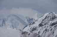 partie neigeux on trouve le pic Pyramida 5302 ; ensuite, plus loin et devant les nuages,