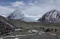 Mais cette quiétude des lieux ne devait pas durer très longtemps. Car la troupe des porteurs allait bientôt arriver, et quarante porteurs en pareil lieu, cela fait du monde ! En un rien de temps le sentier de moraine du glacier de Semienova a pris des airs de montée au refuge des Écrins un jour d’affluence… Sauf que tout ce monde n’était là que pour le bien-être des seulement neuf touristes que nous étions. Y penser laissait tout de même une impression un peu bizarre… ![]()