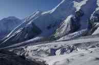![]() Le pic de Marbre photographié par Martine Grive depuis l'arête du Karlytau, le 21 août 2009 ![]() Avalanche sur le glacier Iniltchek, le 22 août 2009 (photo : Damien Broussole) De gauche à droite : le pic de Marbre (6145 m) ; un sommet de 6497 m situé en territoire