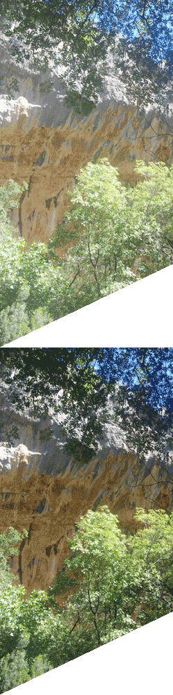 L’itinéraire à l’intérieur de la gorge est balisé successivement de trois couleurs (vert, jaune et rouge), en fonction de la difficulté croissante de la progression. Mais comme la visite est en aller-retour, chacun est libre de rebrousser chemin quand bon lui semble. J’ai arrêté parmi les premiers, peu après le passage à la couleur jaune (il y avait déjà de gros blocs à franchir, le genre d’acrobaties qui n’est plus trop de mon âge). Le reste du groupe a continué, abordant franchement la zone rouge, au moins pour part d’entre eux. ![]() ![]() La gorge est assez spectaculaire, même si elle souffre de la comparaison avec l’un des cañons de Madagascar que j’ai visité quatre ans auparavant (un voyage que je tarde à rédiger, soit dit en passant, et de fait ces quatre années en paraissent dix). Point commun entre les deux sites, la présence de parois inclinées et donc surplombantes. ![]() Des surplombs qui donnent des idées à certains, bien évidemment. Les gorges de Gorropu constituent un site d’escalade réputé, et nous pouvions apercevoir, au-dessus de nos têtes, quelques grimpeurs suspendus à leur fil. C’est assez impressionnant mais difficile à photographier. ![]() ![]() Ensuite le pique-nique : salade de pâtes et gâteau sarde. Une source nous a permis de remplir nos gourdes avant la remontée.